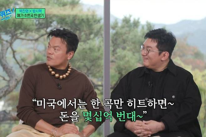 방송인 조세호가 “지금까지 가지고 계신 저작권 1위는 뭐냐”라고 묻자, 박진영은 “가장 최근 게 (잘 나온다)”라며 “트와이스 곡들이다. 그냥 단위가 다르다”라고 전했다. 그러면서 그는 “옛날 시혁이랑 저랑 이런 말을 했다. ‘미국에서는 한 곡만 히트하면 돈을 몇십억 번대’라고 했다”라며 “진짜 그렇게 됐다”라고 말해 저작권으로 벌어들이는 수입을 짐작하게 했다.