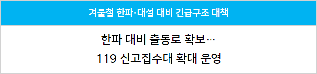김조일 소방청 119대응국장은 “평균기온은 상승 추세지만 급작스러운 기상악화 등으로 인해 폭설 및 한파 피해가 지속적으로 발생하고 있다”며 “중앙119구조본부와 특수구조대 등 한파·대설 예상지역에 소방력을 사전 배치하는 등 피해 최소화를 위해 장비와 인력 등 모든 소방력을 집중하겠다”고 전했습니다.
