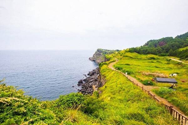 9월 현재는 여름의 짙은 녹음에서 가을로 넘어가는 과도기로, 푸른 바다와 초록빛 풀밭이 어우러진 시원한 풍경을 만날 수 있어요. 가을이 깊어지면 억새와 들꽃이 만발한 가을 정취를, 겨울에는 한라산까지 보이는 탁 트인 시원한 전망을 감상할 수 있답니다.