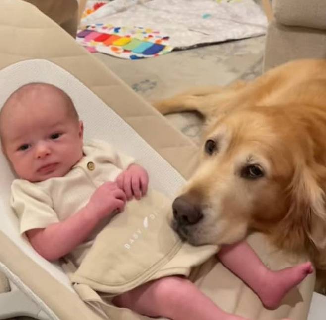공개된 영상 속에 따르면 골든 리트리버 강아지 라일리는 놀라울 정도로 자연스럽게 아기 곁에 다가갑니다.