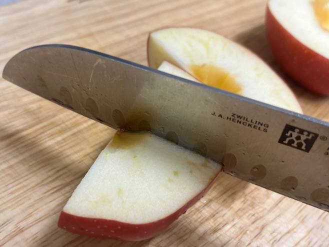 씨를 제거한 사과 덩어리는 먹기 좋은 크기로 여러 등분으로 자릅니다.