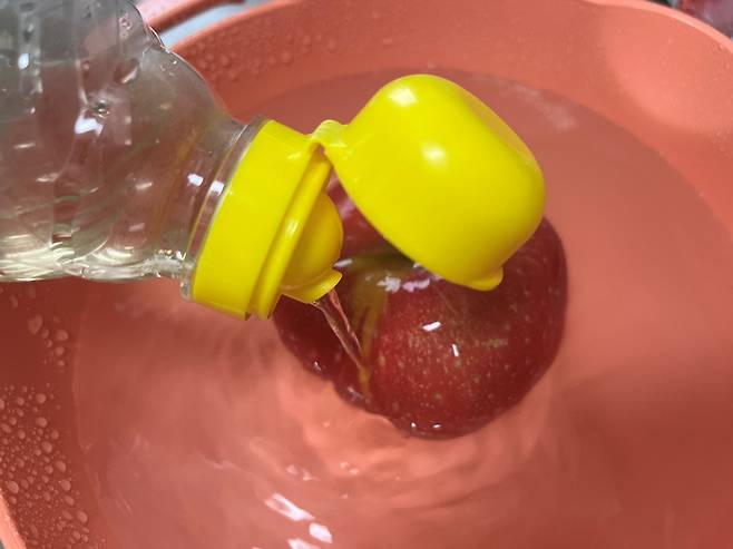 사과를 껍질째 먹는다면 식초 1스푼을 물에 희석하여 사과를 약 3분 담가 두세요. 식초 희석한 물에 사과를 담그면 껍질에 남아 있는 농약, 왁스, 세균 등을 효과적으로 제거할 수 있습니다.