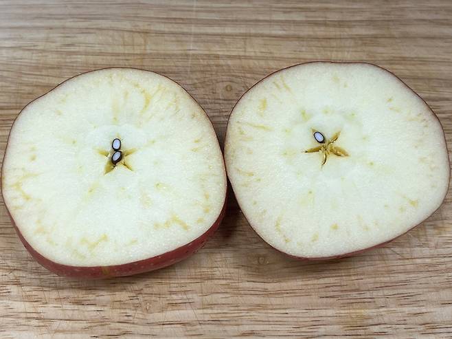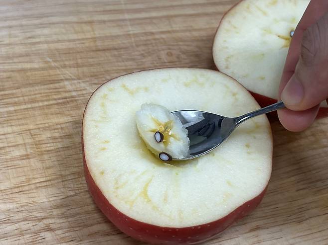 사과를 눕혀서 반 자르면 이렇게 이등분되는데 요. 가운데에 씨가 몰려 있는 것을 확인할 수 있습니다.