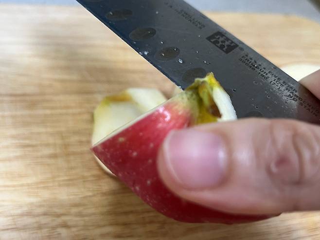 사과 조각 중에 꼭지나 배꼽 부분이 붙어 있는 것들이 있습니다. 이런 조각만 밑에 붙은 꼭지, 배꼽 등을 살짝 제거해 주세요.