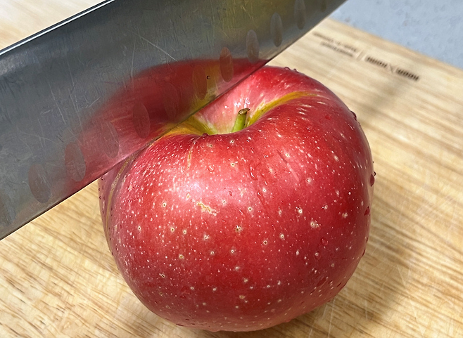 사과를 눕혀서 자르면 시간도 훨씬 단축되고 손질도 더욱 쉽습니다. 과일을 잘 썰지 못하는 초보자도 얼마든지 안전하게 사과를 손질할 수 있습니다.