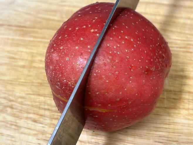 새로운 방법은 바로 사과를 눕혀서 자르는 것인데요. 기존에 꼭지가 위로 가게 해서 자르던 것과 대조됩니다. 사과는 눕혀서 반으로 잘라 주세요.