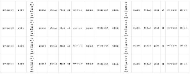 환경부 산하 국립환경과학원 교통환경연구소 자료에 따르면 KGM은 지난 25일 무쏘 스포츠, 무쏘 스포츠 칸의 배출가스 및 소음 인증을 완료했다.