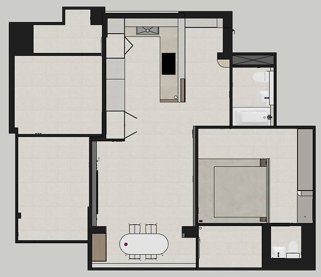 인테리어 업체와 5번의 미팅을 거쳐 완성한 레이아웃이에요. 확장된 구축 타워형 구조로 불필요한 공간, 좁은 부엌과 현관, 분절된 거실 등 단점이 참 많았어요.
