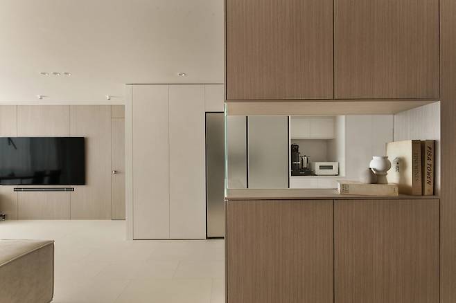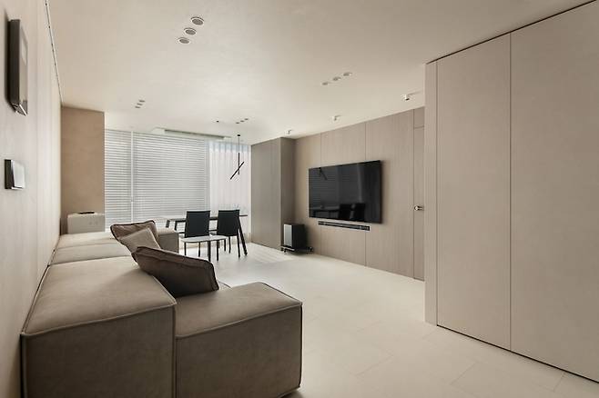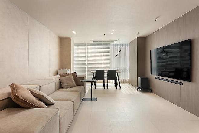 거실을 바라볼 때 좌측 소파 면은 베이지 톤, 우측 TV 면은 우드톤이 보여요.