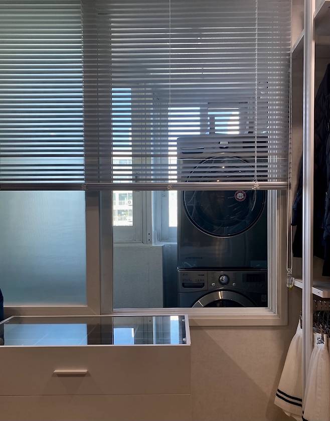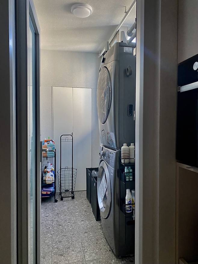 드레스룸과 세탁실이 이어져서 세탁물 동선이 간편해졌어요. 이전 상태를 봐둔 덕분에, 이쪽은 특별 관리 대상으로 주 3회 환기 들어갑니다!