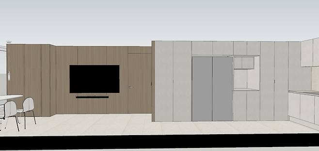이런 단점들을 최소화하면서 공간을 효율적으로 쓰기 위해 고민을 많이 했던 것 같네요. 현관 중문을 없애고, 가벽을 세우며 주방을 늘리고, 히든 도어를 배치하여 넓어 보이도록 하는 등 다양한 시도를 했답니다. 다만 로망이었던 대면형 주방을 포기하게 된 것이 조금 아쉬워요.