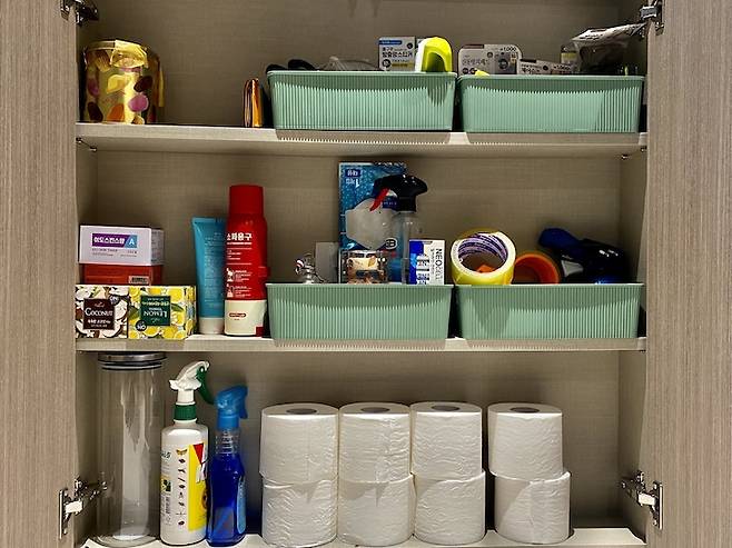 작은 수납장이라도 곳곳에 있으니 자주 사용하는 집기들을 숨겨두기에 참 편리해요. 물건들을 밖에 두지 않으니 깨끗한 집을 유지할 수 있는 것이 장점이에요. 바로 앞이 공용 화장실이다 보니, 화장실 용품도 많이 들어가 있네요. ^_^;