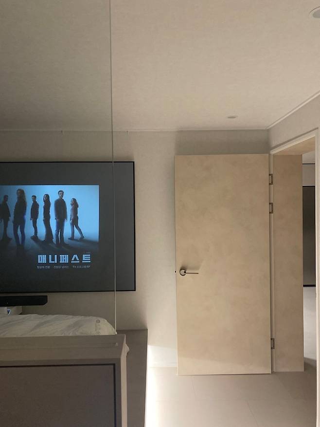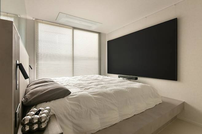 이전 침실에서 쭉 사용하던 초단초점 시네빔과 프레임 스크린을 그대로 활용했어요. 공간이 부족하면 포기하려 했었는데, 매트리스 앞 쪽에 공간이 확보되면서 빔프로젝터를 계속 쓸 수 있게 되었네요. 매트리스가 크다 보니 시네빔 공간까지는 고려하지 못했는데 운이 좋았어요.