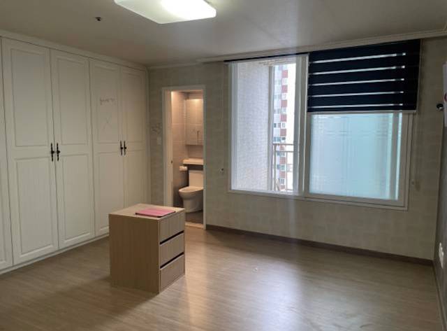 안방의 한쪽 벽면은 전체가 붙박이장으로 되어 있었고, 작은 화장실도 있어요. 큰 창은 베란다로 통하는 창문이에요.