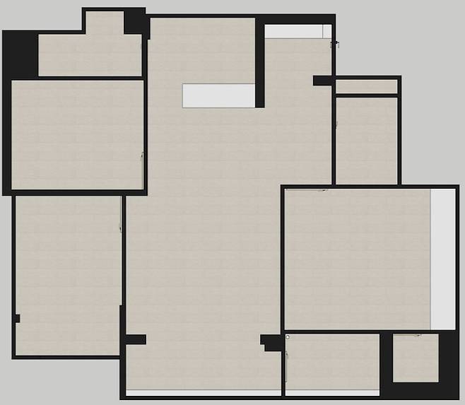 기존 거실의 모습은 확장된 내력벽 날개와 방문들 때문에 들쑥날쑥이 참 많았어요. 저 면을 매끄럽게 표현하고 이어지게 만들고 싶었답니다. 완전한 일자로 만들기엔 포기해야 되는 면적이 많아서 집이 좁아질 것 같았어요.