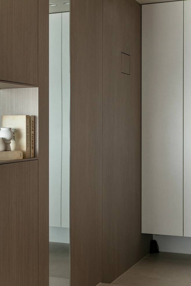 흔치 않은 베이지 필름과 어울릴 우드 필름 고르는 것은 꽤 어려웠어요. 실물 샘플을 넓게 펼쳐서 몇 번이나 대조해 봤는지 모르겠어요. 결국 포근한 우드 색상에 나무 질감이 느껴지는 제품으로 선택했고, 시공 후 모습도 참 만족스러워요. 그리고 전신거울은 우드 벽면 사이에 홈을 만들어 돌출되지 않게 매립할 수 있었습니다.