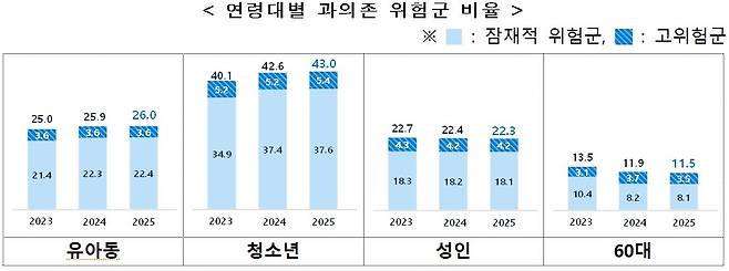 연령대별 위험군 비율은 10~19세 청소년이 전년보다 0.4%p 늘어난 43.0%였고, 3~9세 유아동은 0.1p 증가한 26.0%로 높은 편이었다. 반면 성인은 20~59세가 전년보다 0.1%p 감소한 22.3%였고, 60대는 0.4%p 내려간 11.5%를 차지했다.