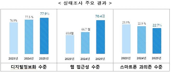 '디지털 정보화' 수준을 부문별로 보면 디지털 역량은 65.9%, 디지털 활용은 80.5%, 디지털 접근은 96.6%로 모든 부문에서 전년보다 조금 나아졌다. 계층별로는 고령층이 71.8%로 가장 낮은 수준을 보였으나 전년 대비 0.4%p 올랐다. 농어민은 80.6%, 장애인은 84.1%, 저소득층은 97.0% 순이었다.