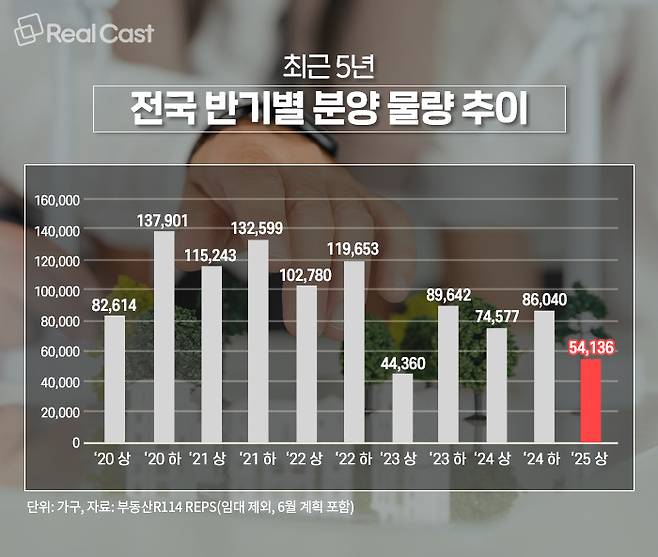 부동산R114 REPS 자료에 따르면, 올해 상반기 동안 전국에 5만4,136가구(일반분양 기준, 임대 제외, 6월 계획분 포함)가 분양된 것으로 조사됐습니다. 이는 지난해 하반기 8만6,040가구와 비교하면 37% 감소한 물량인데요. 2023년 상반기(7만4,577가구)와 비교해도 25% 줄었고, 최근 5년 새 추세를 보더라도 점차 줄고 있음을 알 수 있습니다.