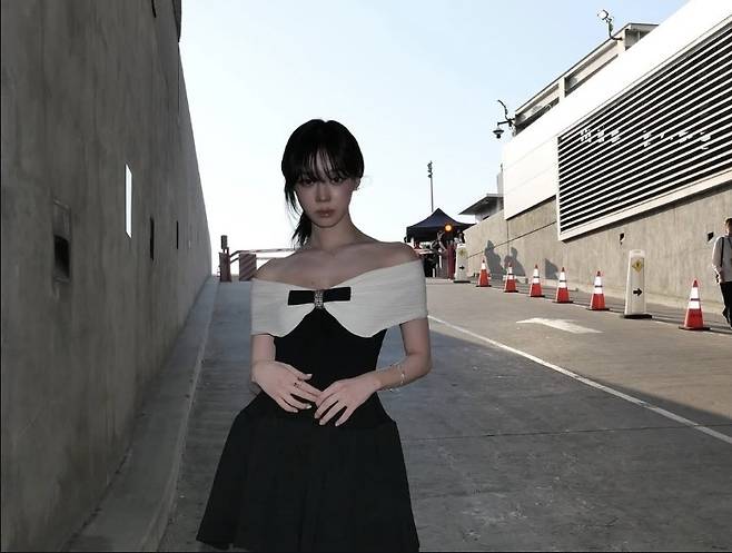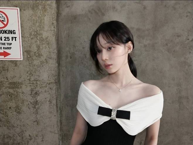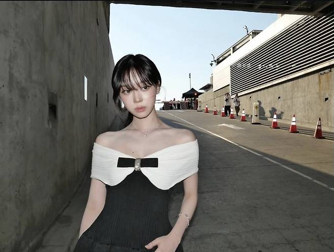 윈터는 블랙과 아이보리 투톤이 조화를 이루는 오프숄더 드레스를 착용해 어깨 라인을 부드럽게 감싸는 아이보리 플리츠 디테일과 중앙의 블랙 리본 장식, 그리고 그 위에 더해진 주얼 브로치로 클래식한 포인트를 더했습니다.