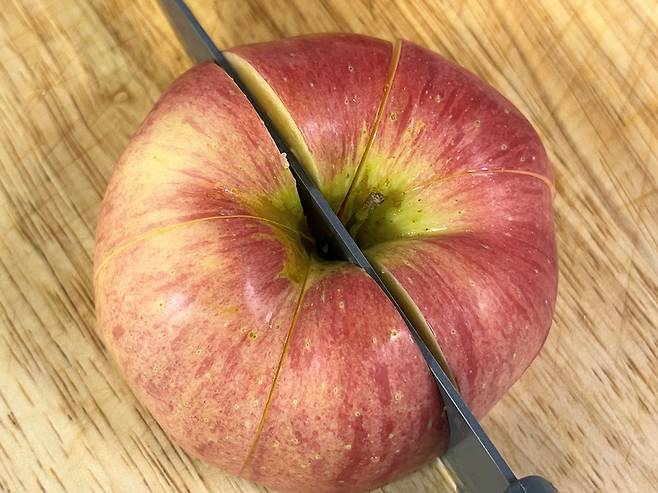 하지만 사과는 자르는 방향만 조금 바꿔도 손질 과정이 훨씬 단순해집니다. 씨를 한 번에 정리할 수 있고, 칼질 횟수도 줄어들어 훨씬 깔끔하게 손질할 수 있습니다. 이제는 사과, 더 이상 세워서 자르지 마시고 눕혀서 가로로 자르세요!
