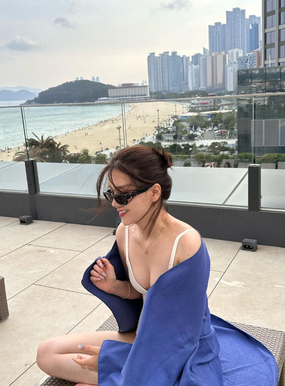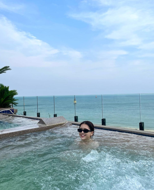 김지은은 인피니트풀에서 선글라스를 끼고 바캉스룩을 선보였는데요.