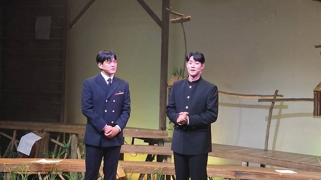 | ▲ 뮤지컬 <민들레 피리> 첫 공연 무대인사 박영수 배우(오른쪽)의 첫 공연을 맞아 임진섭 배우와 함께 무대 인사를 진행하고 있다. |