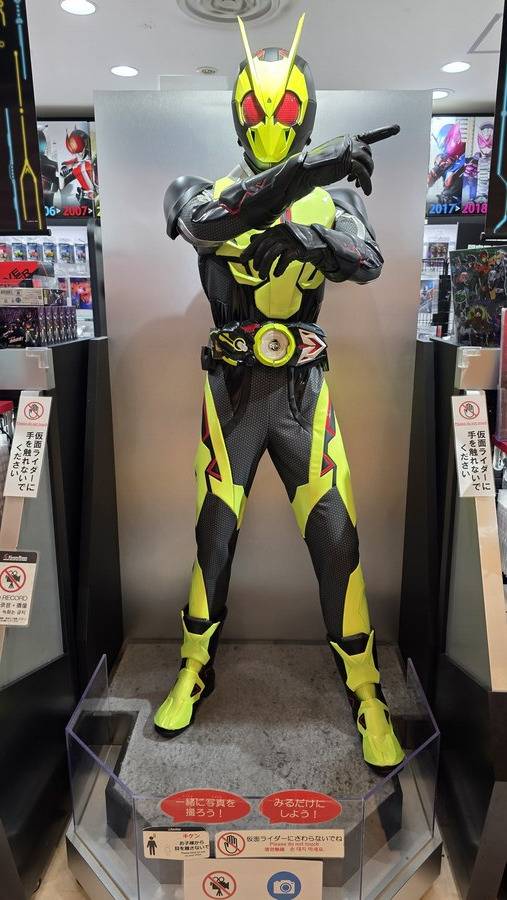 매장 앞에 멋지게 서 있는 가면라이더 제로원!