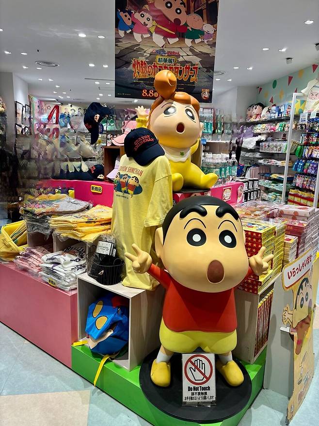 다양한 짱구 굿즈들이 즐비하고 매장 앞에는 짱구와 짱아 남매가 있습니다.