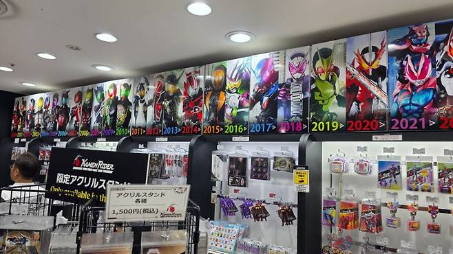 매장 위에는 헤이세이부터 레이와까지 역대 가면라이더들을 쫙 소개하고 있네요.