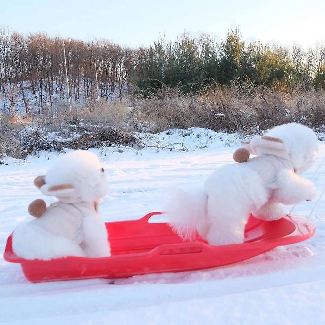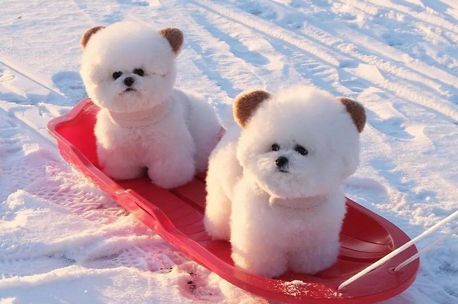눈썰매 위에 있는 두 마리의 비숑은 화보촬영을 위해 세워둔 인형 같아 보입니다.