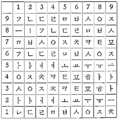 둘째, 열쇳말을 만들었다. 세 음절로 이뤄진 열쇳말을 정해, 교신 당사자끼리 공유했다. 예컨대 공청 중앙부와 함남도위원회 사이의 교신 열쇳말은 ‘금강산’이었다. 이 열쇳말에서 중요한 것은 음절이 아니라 ‘음소’였다. ‘금강산’은 ㄱㅡㅁㄱㅏㅇㅅㅏㄴ이라는 9개 음소로 분해되고, 각 음소는 숫자판의 첫 번째 세로줄에 차례대로 배치됐다. 한글의 자음과 모음이 어떤 순서로 쓰이는지는 교육받은 조선 사람에게 이미 상식과 같은 것이었다. 자음은 ㄱㄴㄷㄹㅁㅂㅅㅇㅈㅊㅋㅌㅍㅎ 순으로, 모음은 ㅏㅑㅓㅕㅗㅛㅜㅠㅡㅣ순으로 불리지 않는가. 이 순서대로 숫자판의 여백을 채우면 됐다.
