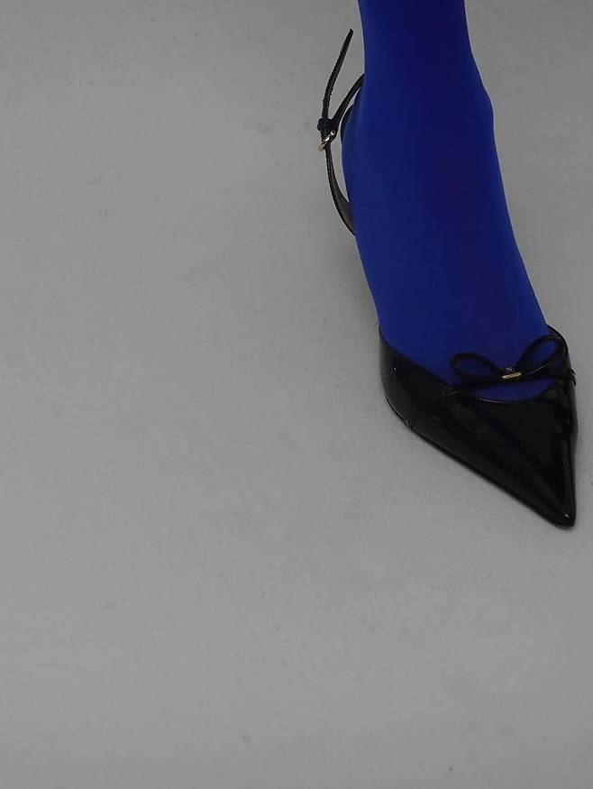 윈터의 룩에서 중심을 잡아준 건 단연 발끝까지 이어지는 컬러 포인트다. 깊고 선명한 블루 톤 스타킹은 매끈한 실루엣을 완성하며, 모던하면서도 대담한 감각을 표현했다. 여기에 더해진 스트랩 힐은 에나멜 블랙으로 광택감을 살리며, 미니멀한 리본 디테일이 클래식한 포인트로 자리한다. 얇은 스트랩과 골드 버클은 전체적으로 세련된 라인을 강조하며 윈터 특유의 날렵한 이미지와 절묘하게 어우러졌다.