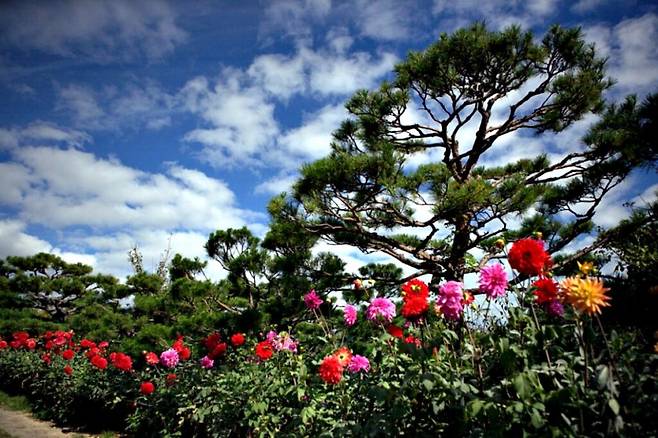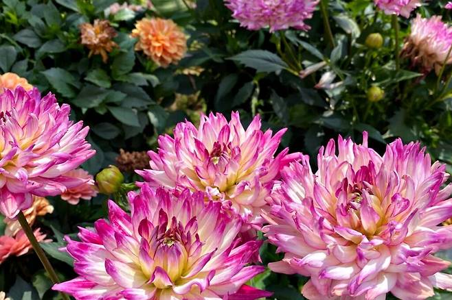 잘 가꾸어진 관광농원에서 현재 흰색, 보라색의 달리아를 볼 수 있다.