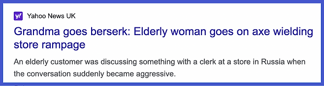 그래서 야심차게 준비한 오늘의 표현! 두구두구! Go Berserk! 제일 위에 준비한 오늘의 기사를 보자. 제목에서부터 써있지? “Grandma goes berserk 할머니가 대격노하다”.