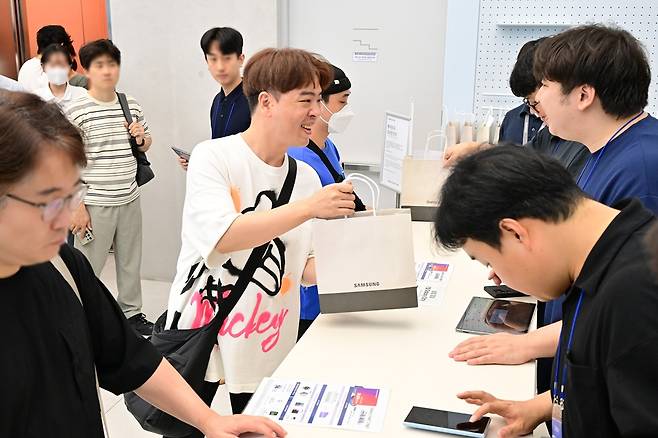 현장의 하이라이트는 단연, 사전 개통 1호 고객 이벤트였습니다. 이날 제일 먼저 제품을 수령한 이우송 씨(22세)는 경기도 성남에서 새벽에 출발해 삼성 강남에 도착했다고 하는데요. 그는 “언팩을 보고 바로 폴드7을 구매 결심했다”며 “1호 고객까지 될 줄 몰랐다”고 소감을 전했습니다.