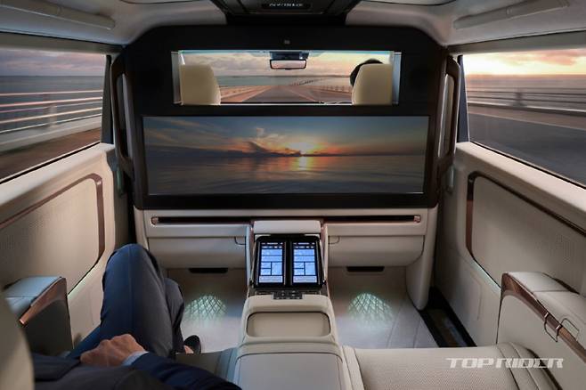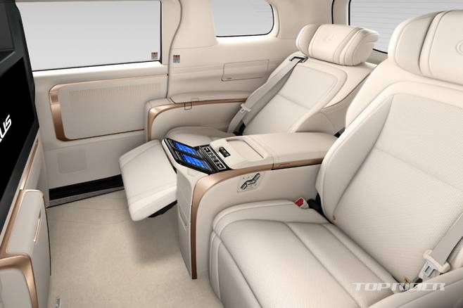 2026년형 LM500h 최상위 모델인 4인승 이그제큐티브 트림은 파워 슬라이딩 도어 버튼 위치가 기존 오버헤드 콘솔에서 2열 센터콘솔로 변경됐다. 오버헤드 콘솔에는 다운라이트가 추가돼 슬라이딩 도어 오픈시 바닥을 비춰 야간에 2열 탑승객의 승하차를 돕는다.