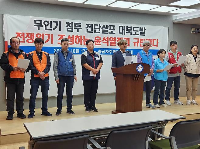 충남자주통일평화연대(아래 단체)는 17일 충남도청 프레스센터에서 기자회견을 열고 "부싯돌 하나만 불꽃이 튀어도 전쟁으로 비화될 수도 있는 상황"이라고 우려했다. 이들은 기자회견문을 통해 "윤석열 정권은 취임 이후 한미 군사훈련의 횟수와 강도를 높이고 있다"며 "대북확성기 방송을 재개하는 것은 물론 올해에만 73회에 걸친 대북전단 살포를 묵인해 군사적 긴장을 높여왔다"고 주장했다.