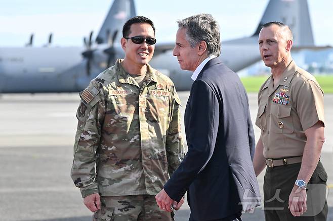 (훗사 로이터=뉴스1) 우동명 기자 = 토니 블링컨 미국 국무장관이 28일(현지시간) 일본을 방문하기 위해 도쿄 훗사에 있는 요코타 공군 기지에 도착해 환영을 받고 있다. 2024.07.28