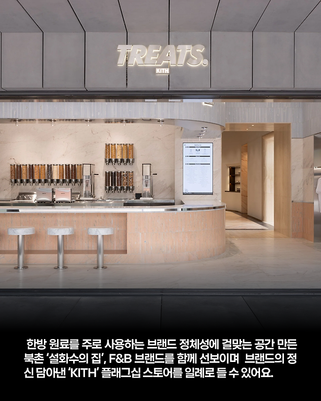 북촌에 위치한 ‘설화수의 집’을 일례로 들게요. 여긴 1930년대 한옥, 1960년대 양옥이 자연스럽게 연결된 공간인데요. 이 곳의 존재 자체가 한방 원료를 주로 사용하는 브랜드 정체성에 걸맞는 공간입니다. ‘KITH’는 성수동 매장에서 그들의 F&B 브랜드를 함께 선보이면서 그 공간 자체에서 브랜드의 정신을 느낄 수 있게 만들었죠.