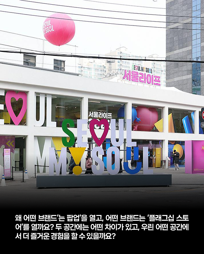 지금 서울이 지닌 활력의 중심에는 공간이 있습니다. 글로벌, 로컬 브랜드 할 것 없이 서울에서 실험적 공간을 만들고 있습니다.왜 어떤 브랜드’는 팝업’을 열고, 어떤 브랜드는 ‘플래그십 스토어’를 열까요? 두 공간에는 어떤 차이가 있고, 우린 어떤 공간에서 더 즐거운 경험을 할 수 있을까요?