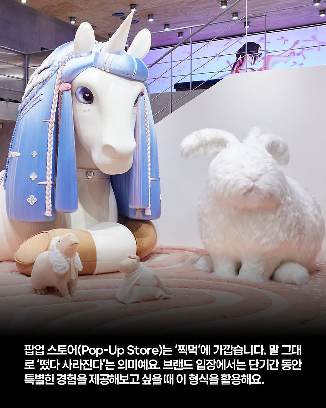팝업 스토어(Pop-Up Store)는 ‘찍먹’에 가깝습니다. 말 그대로 ‘떴다 사라진다’는 의미로 일시적 공간을 의미해요. 브랜드 입장에서는 단기간 동안 특별한 경험을 제공해보고 싶을 때 이 형식을 활용해요. 제품 자랑도 실컷 할 수 있고, 트렌디하고 실험적인 기획으로 사람들의 반응을 살필 수도 있거든요.