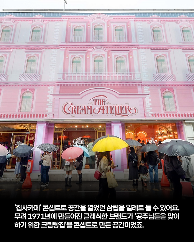 최근 성수동에 ‘집사카페’ 콘셉트로 공간을 열었던 삼립을 일례로 들 수 있어요. 무려 1971년에 만들어진 클래식한 브랜드가 ‘공주님들을 맞이하기 위한 크림빵집’을 콘셉트로 만든 공간이었는데요. 가는 사람 입장에선 재미있는 경험이 되고, 브랜드 입장에선 이미지 쇄신을 할 수 있어 ‘윈윈’하는 공간이었다는 게 전문가들 평입니다.