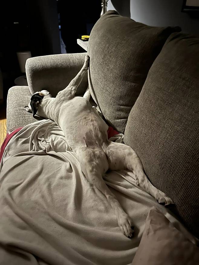 “온몸이 지저분하고 발이며 다리며 등에 상처가 많았어요.” 불록은 말했다. “분리불안이 심해서 다른 동물들 다 재워놓고 레인이랑 소파에 나란히 누워 밤새 함께 있었죠.”
