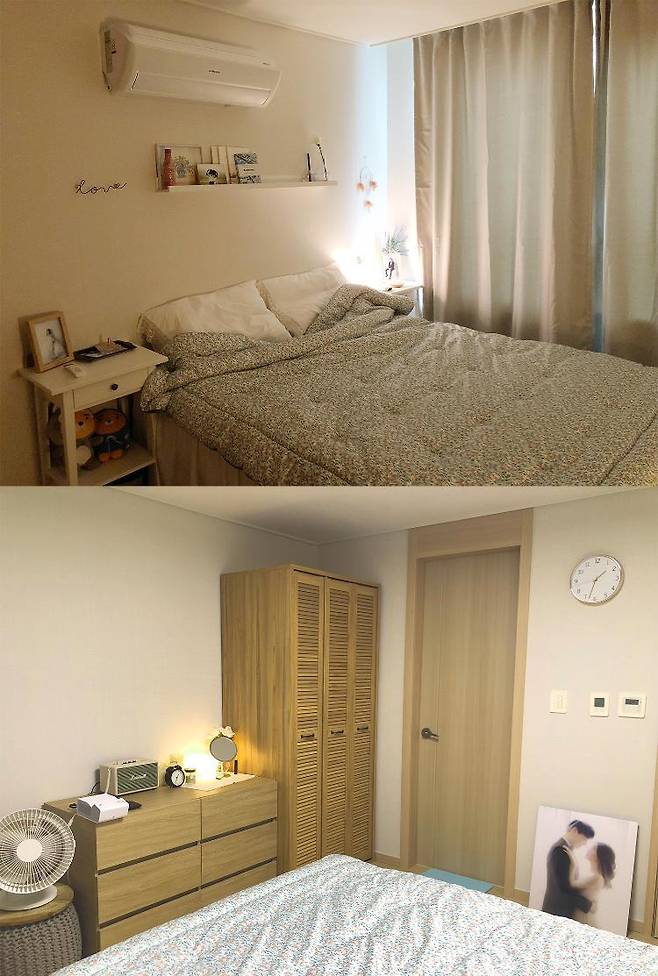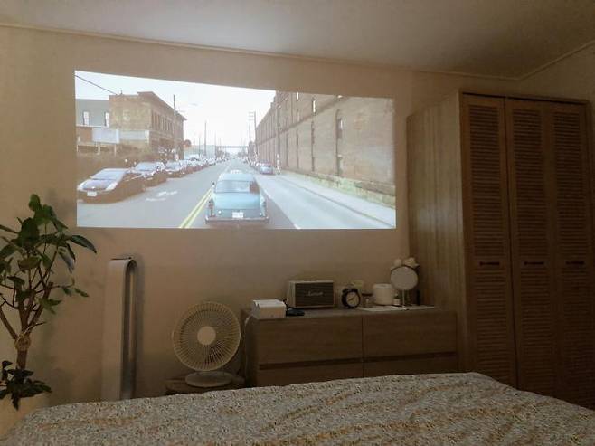 안방의 포인트는 템퍼침대와 빔프로젝터예요. 전동침대라 원하는 각도로 조절해서 영화나 드라마를 보고 있어요!