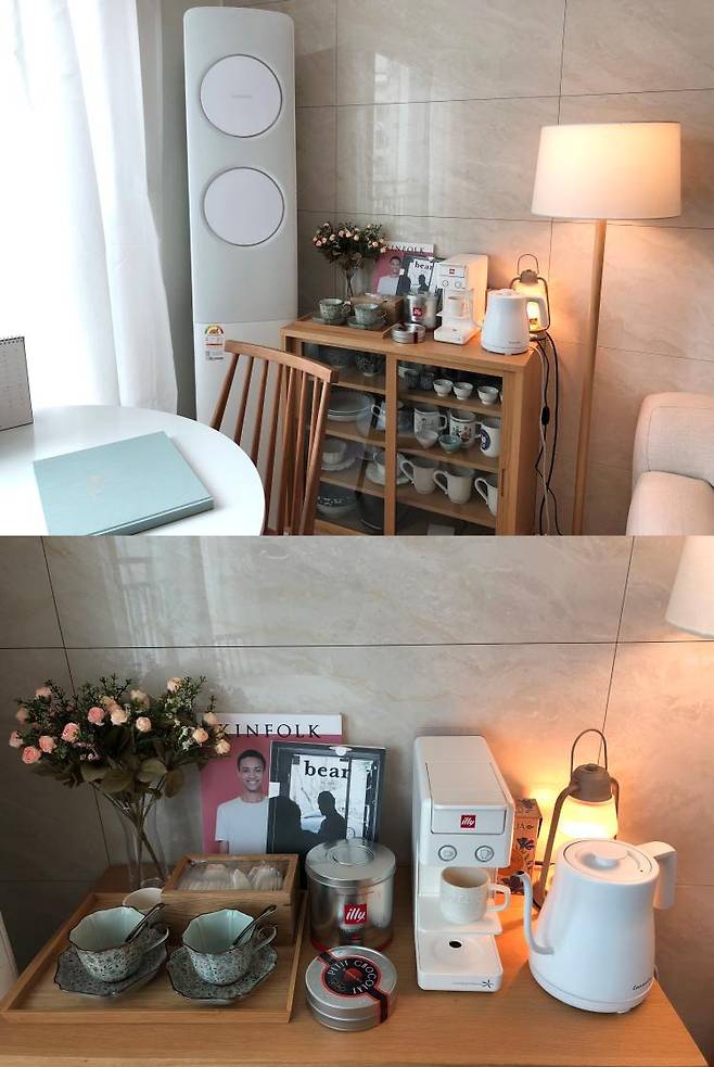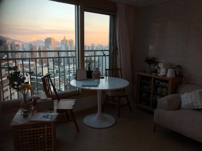 나름 야경이 괜찮아 건물들 보며 커피 마시는 공간을 극대화하기 위해 작은 홈 카페를 만들었습니다.