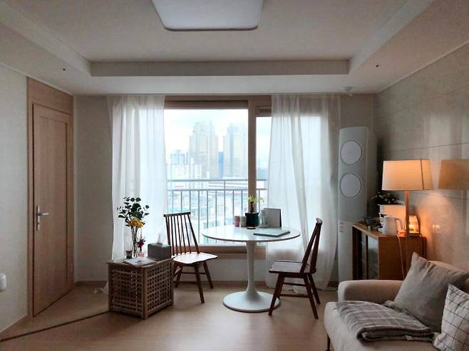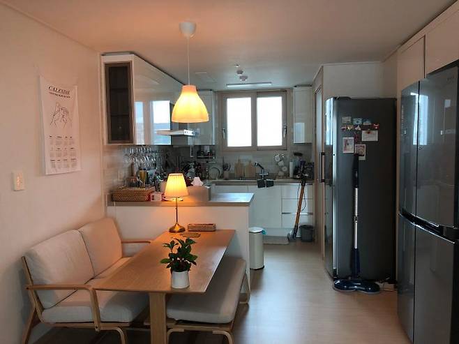 원래는 카페 느낌 내려고 다이닝 테이블을 거실에 뒀었는데, 누워서 티브이 보는 걸 포기할 수 없어서 그냥 소파를 새로 장만했어요.