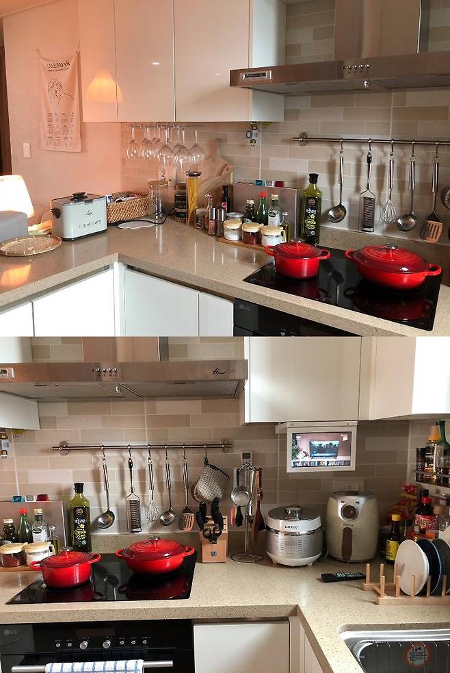 생각보다 요리가 즐거워서 점점 부엌살림이 늘어나는 중인 약간 너저분하지만 편리한 주방이에요. 주방도구 거는 스텐봉은 완전 효자템.