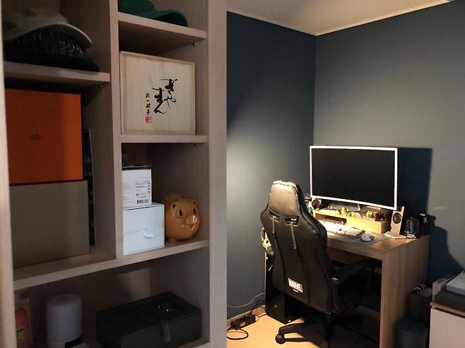 컴퓨터 방으로 꾸며줘야 할 것 같은 느낌이 들어(게임은 못하게 하지만..) 어두운 페인트로 시공했어요.