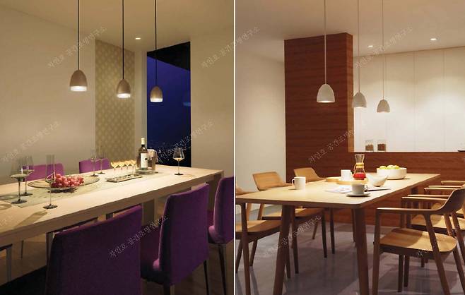 식탁 주변의 간접조명 방식으로 코브, 코니스, 밸런스 타입 등 공간의 목적과 환경에 따라 다양하게 적용할 수 있는데, 전반조명의 기능과 LDK를 연계하여 시선을 소통하게 하고 동선을 편하게 유도하는 목적의 전문 배광 분석이 요구된다.
